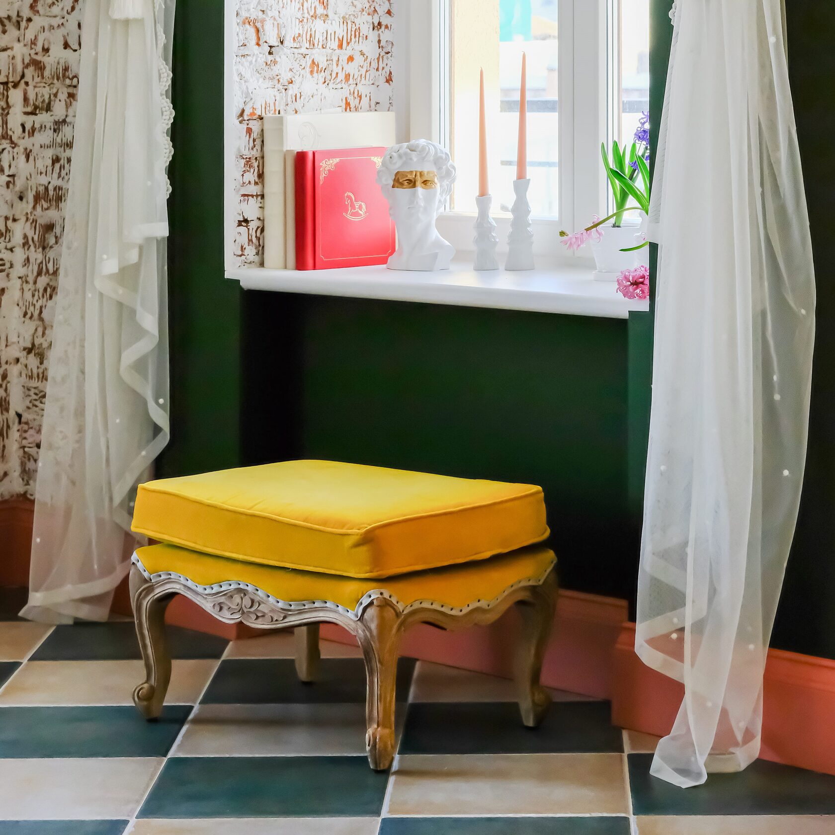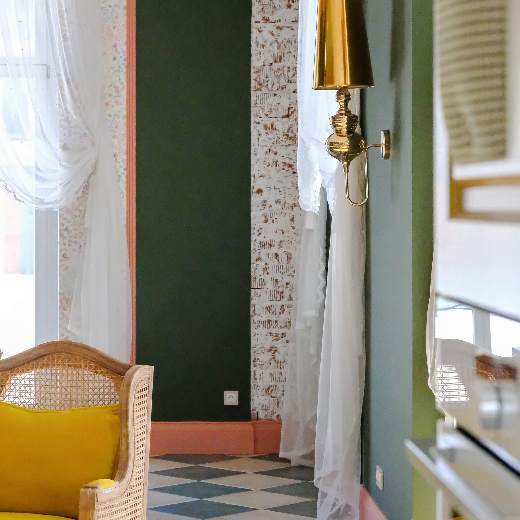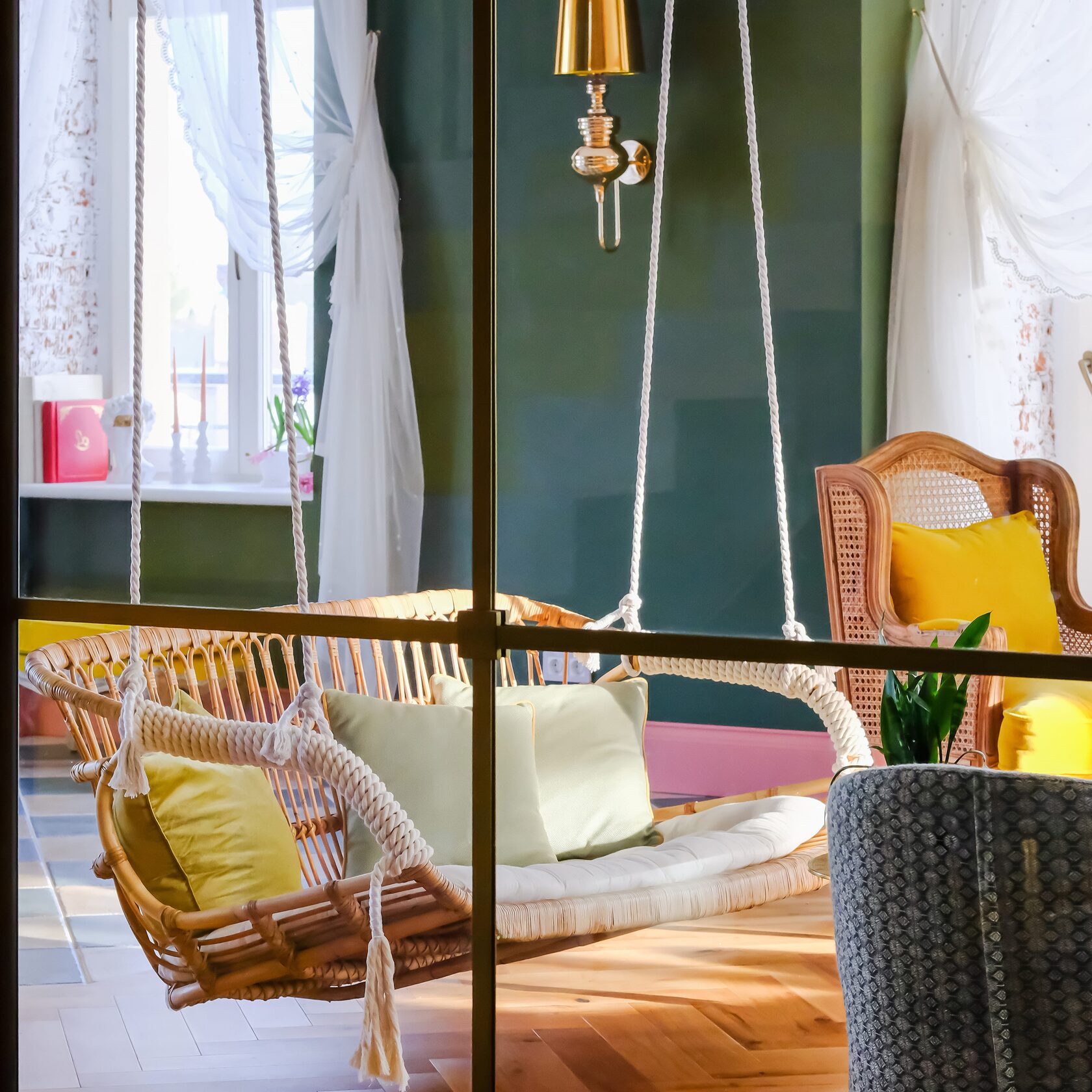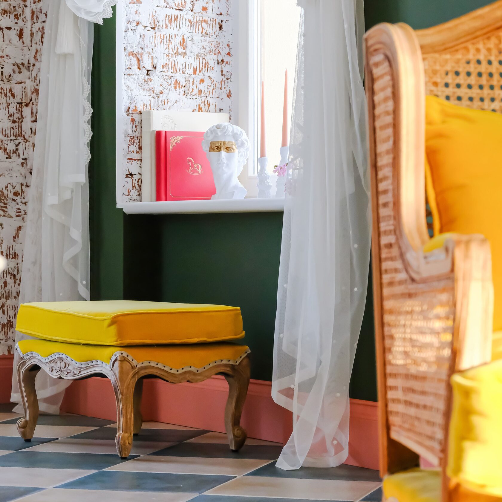Комбинация насыщенного тёмно-зеленого оттенка краски и летних нежных полевых цветов на панно; грубого кирпича покрытого неплотной белой краской на оконных и дверных откосах и лёгких, прозрачных как утренний туман, штор в горошек с кружевным кантом; гипсовых потолочных карнизов, молдингов, напольного плинтуса цвета припыленной розовой глины и невесомых стеклянных плафонов подвесных светильников; дубового паркета медового оттенка и квадратной зеленой с золотистым напылением и бежевой плитки, уложеной франзузским ромбом; тёплая латунь в настенных бра и торшерах, воздух, лучи солнца - танец единства и противоположностей - притягательный фон для коллекции разных по стилю и духу, но таких любимых и удобных предметов мебели и милых сердцу вещиц. Прислушайтесь, звуки самбо, джаза, иногда классики, иногда детских песен и чтение произведений юных талантов...