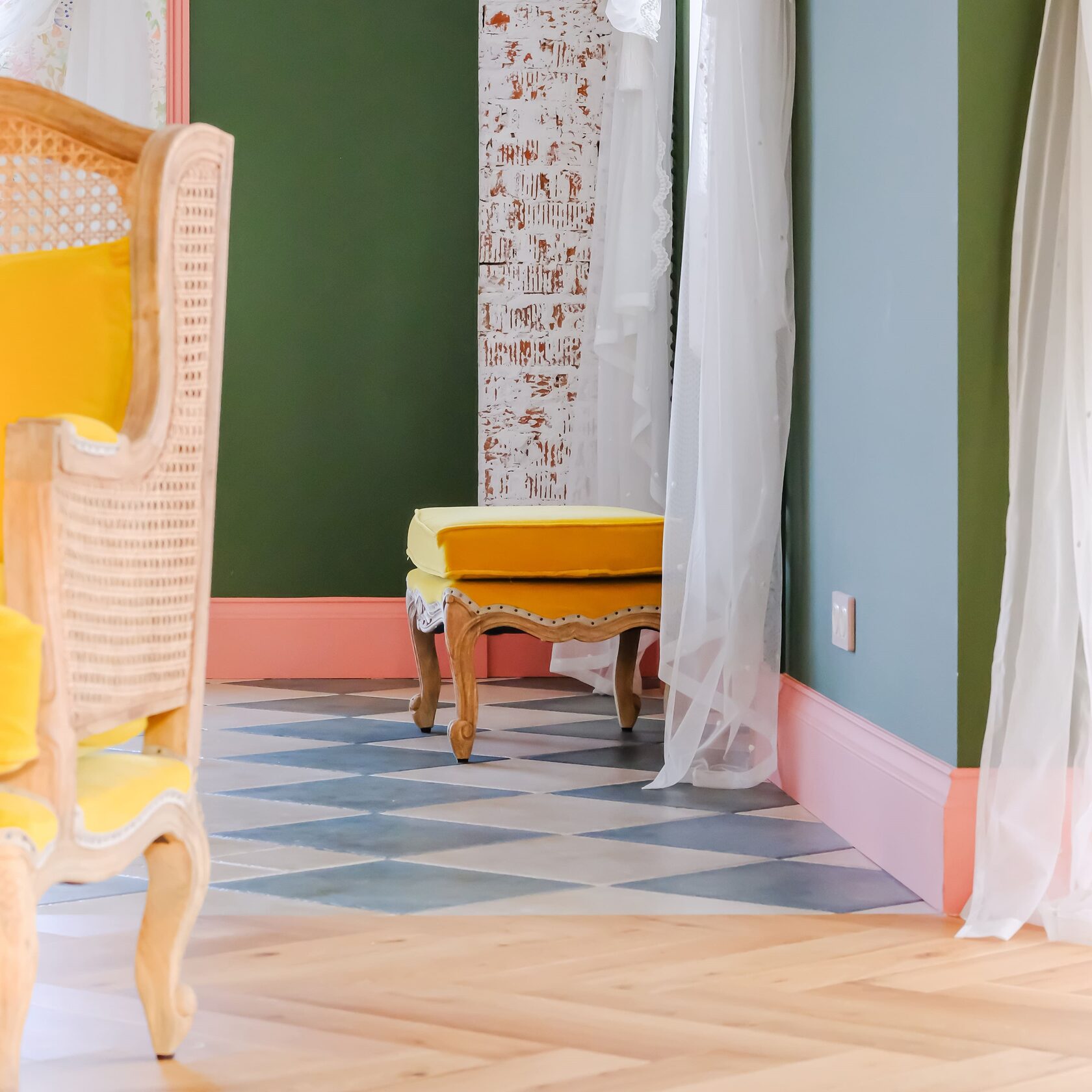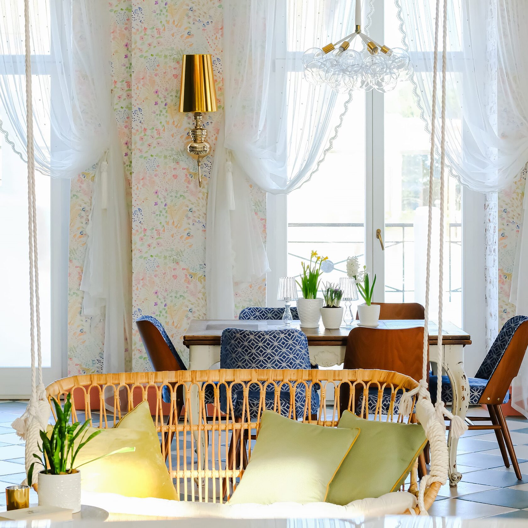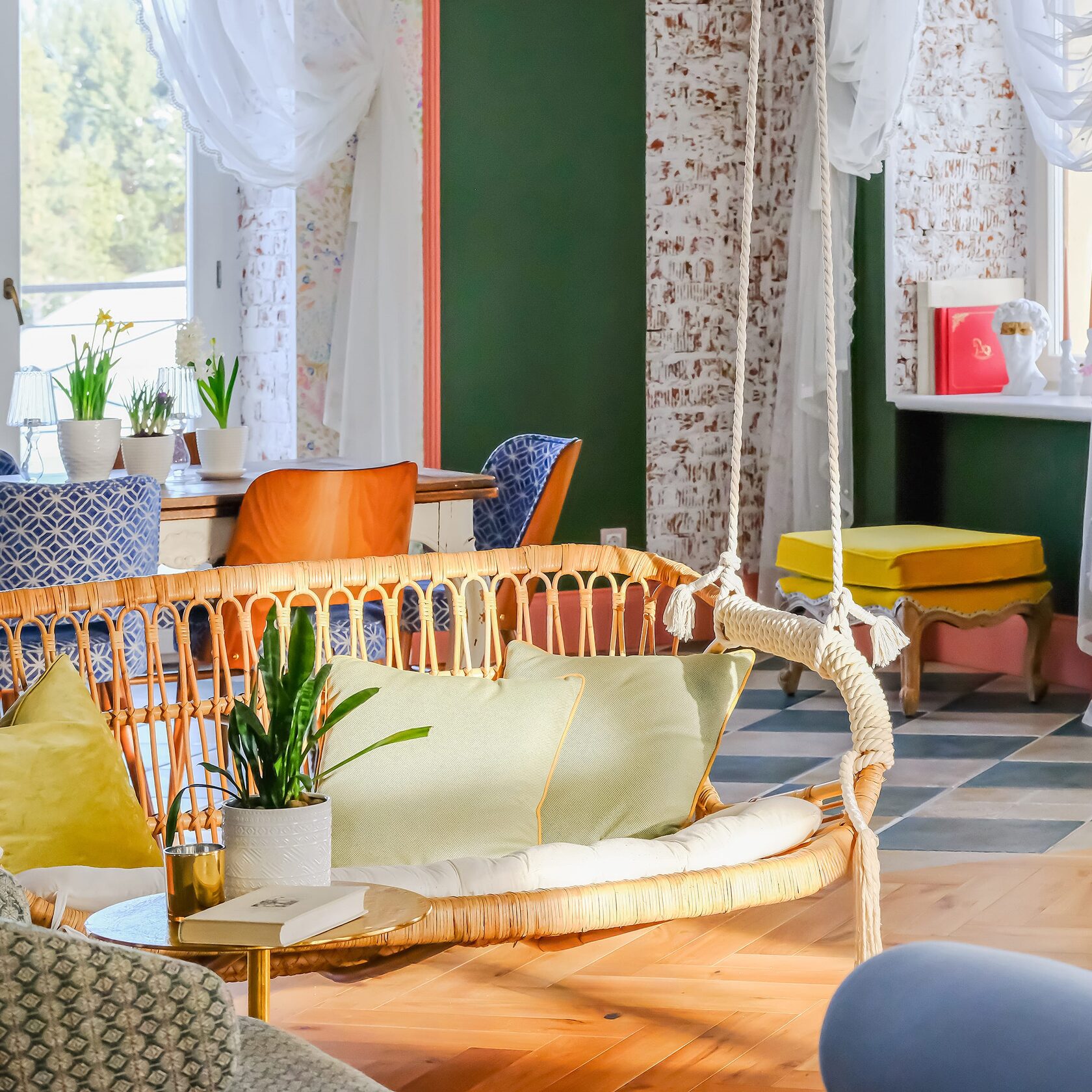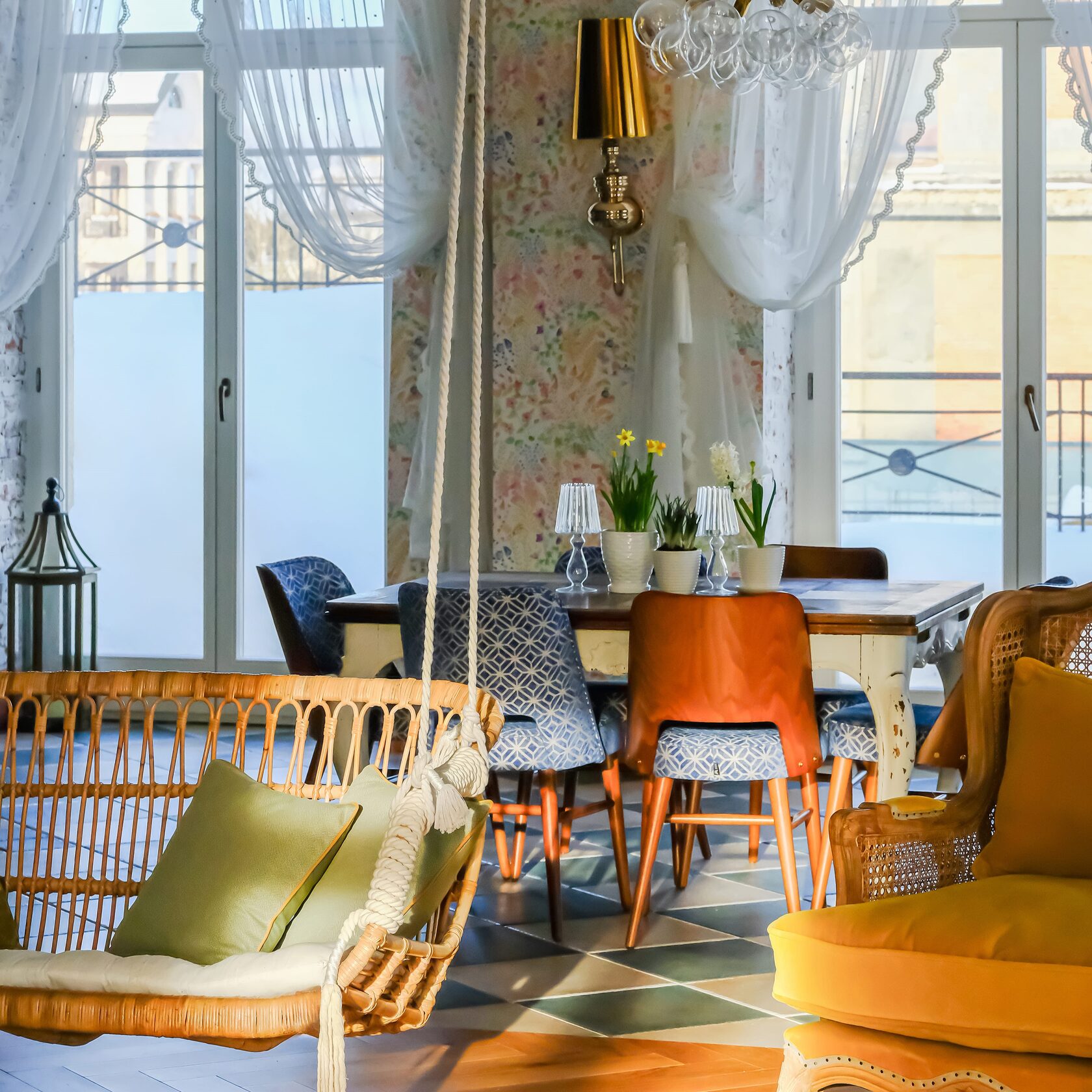 Комбинация насыщенного тёмно-зеленого оттенка краски и летних нежных полевых цветов на панно; грубого кирпича покрытого неплотной белой краской на оконных и дверных откосах и лёгких, прозрачных как утренний туман, штор в горошек с кружевным кантом; гипсовых потолочных карнизов, молдингов, напольного плинтуса цвета припыленной розовой глины и невесомых стеклянных плафонов подвесных светильников; дубового паркета медового оттенка и квадратной зеленой с золотистым напылением и бежевой плитки, уложеной франзузским ромбом; тёплая латунь в настенных бра и торшерах, воздух, лучи солнца - танец единства и противоположностей - притягательный фон для коллекции разных по стилю и духу, но таких любимых и удобных предметов мебели и милых сердцу вещиц. Прислушайтесь, звуки самбо, джаза, иногда классики, иногда детских песен и чтение произведений юных талантов...