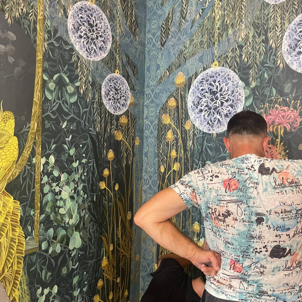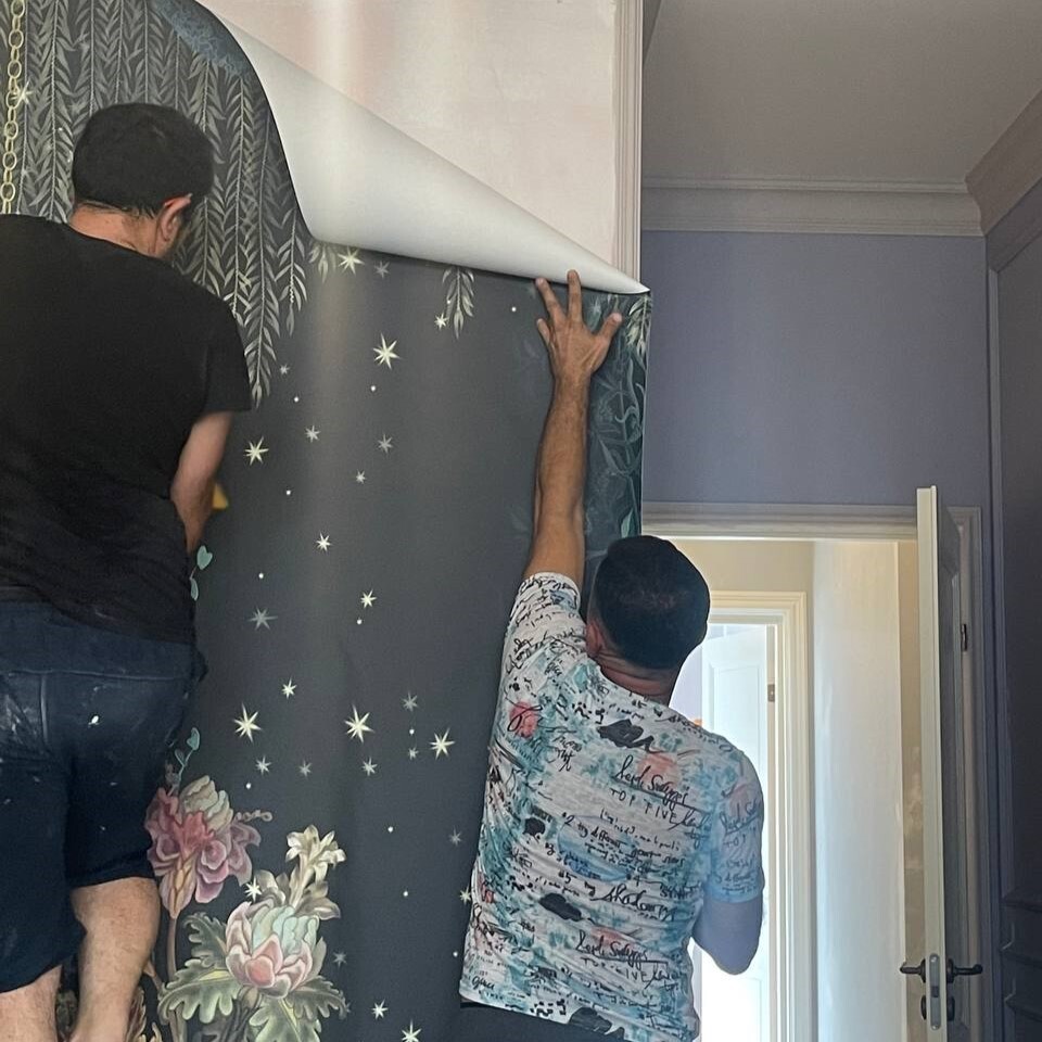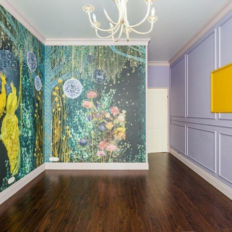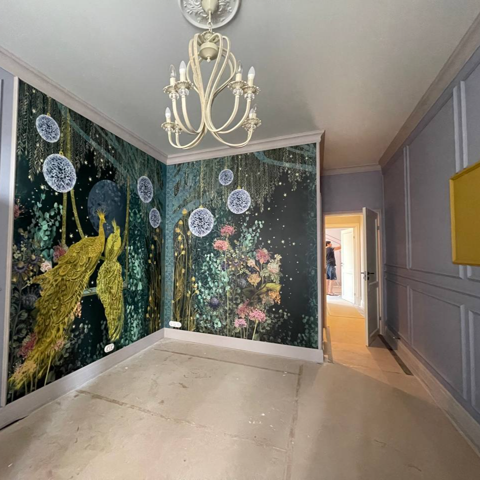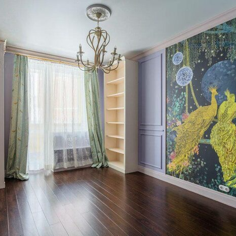 Душа юной бунтарки требовала более тёмной прохладной палитры, хотя чего-то нежного и девичьего тоже хотелось. Противоречие помогла разрешить чудесная фреска, которую я нашла просматривая очередной каталог. В ней сошлось всё - романтичный и нежный сюжет с жар птицами, цветовая гамма, сказочные похожие на праздничные фейерверки цветы.