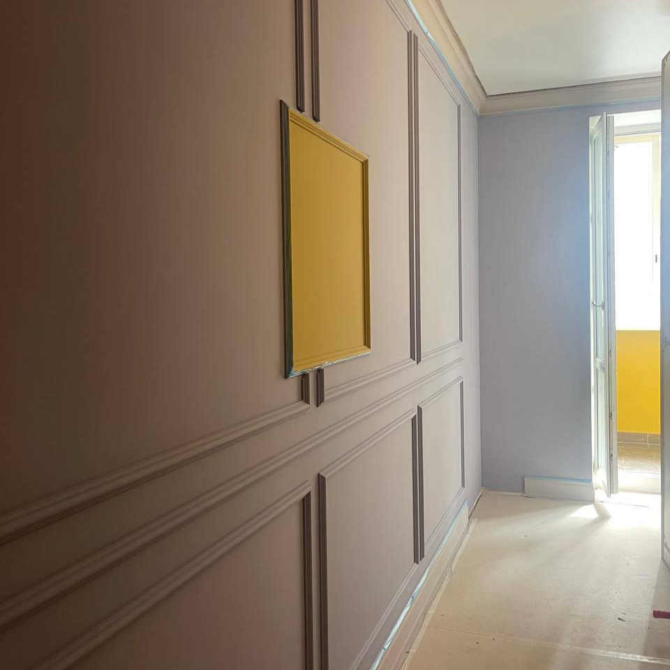 Оставалось только поддержать всё это стенами цвета светлой лаванды, добавить настенные молдинги в классической французской раскладке, как и во всех остальных комнатах этой квартиры, дабы придать объёма и торжественности. Уравновесить всё светло-серыми потолочным карнизом и напольным плинтусом. Ах да, и, конечно, впустить "луч солнца золотого... " в виде жёлтого акцента на противоположной от фрески стене - прекрасный галерейный фон для любимой фотографии, рисунка или картины. В результате, получился романтичный, нежный, светлый и не такой как у всех интерьер для юной мадмуазель. Комната, в которой приятно учиться, отдыхать, беседовать и, конечно, мечтать. Мама и дочь были очень довольны. А ещё нам повезло, что к этой комнате примыкал застеклённый балкон, в котором расположилась солнечная творческая.